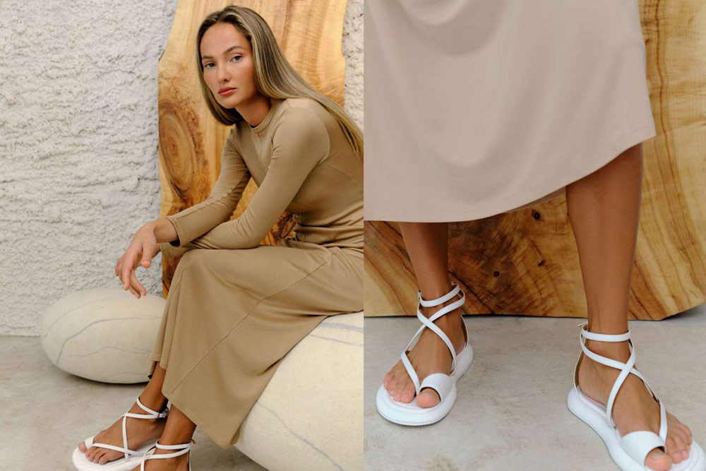 Для жаркого летнего сезона — открытые модели обуви: белые сандалии на ремешках и литой подошве с эффектом объема и универсальные мюли с закругленной носочной частью на устойчивом каблуке. Такие стилисты рекомендуют сочетать с длинными платьями и юбками-миди